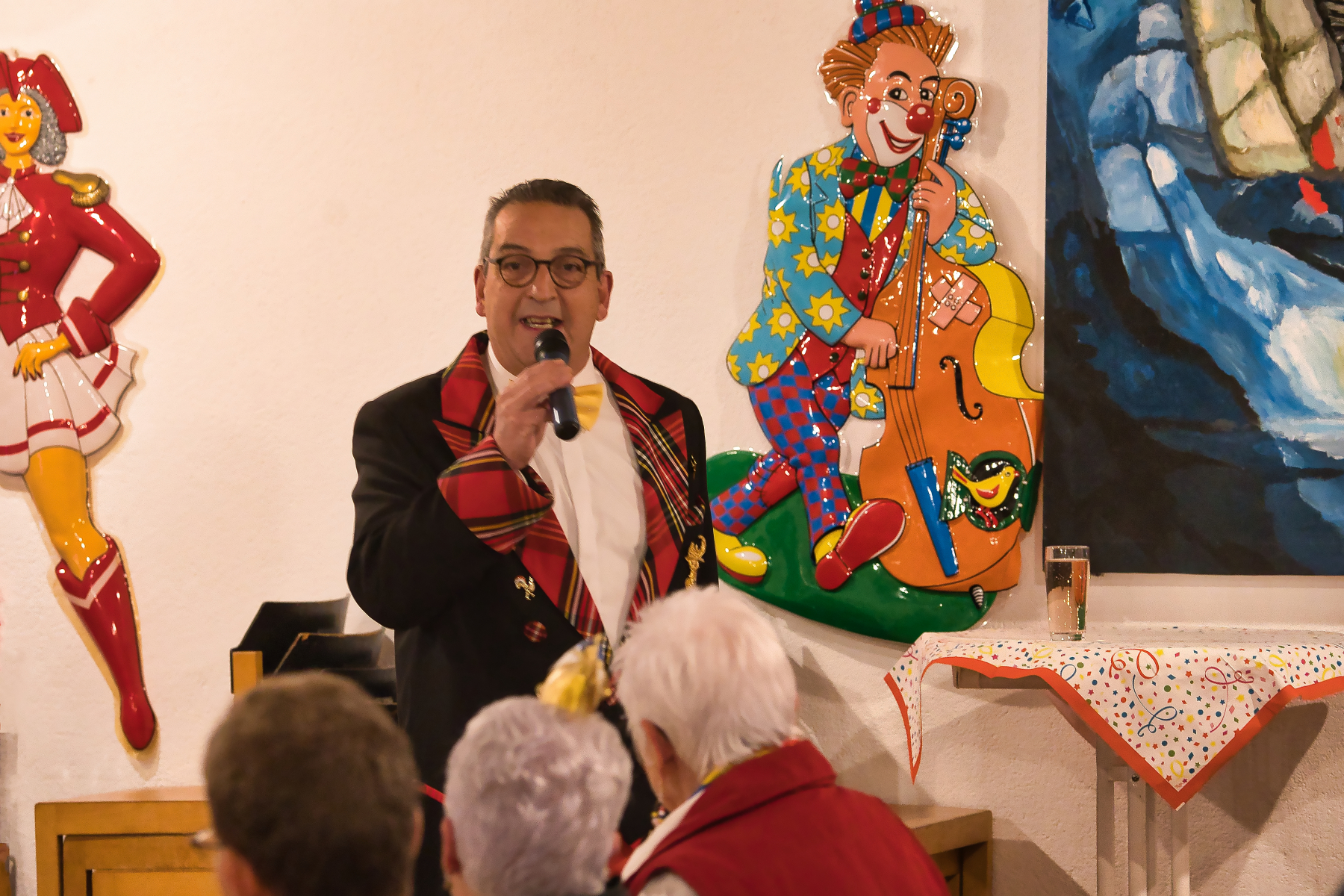 Die anwesenden Närrinnen und Narren wurden auf das Närrische Grundgesetz eingeschworen und begeisterten sich an Geschichten und Witzchen, die Joachim Kleintitschen allenthalben einstreute, genauso wie an den weiteren Darbietungen. Bernd Cornelius (Zugmarschall) und Diethard Engel (2. Schriftführer) präsentierten sich mit Reim und Gesang als Erklär-Dino bzw. zukünftiger Internet-User. Pit Rösch unterhielt die Anwesenden mit einem schönen Potpourri aus fastnachtlichen Liedern, und schließlich trug der Abgesandte des Altstadtadels, Jochen Behrendt, wundervoll dargebotene Geschichten aus dem Meenz von damals vor. Für die musikalische Untermalung sorgte Hansi Sprenger. Für das leibliche Wohl zeichnete unser hervorragend organisierter Wirtschaftsausschuss unter der Leitung von Simone Schüler verantwortlich.