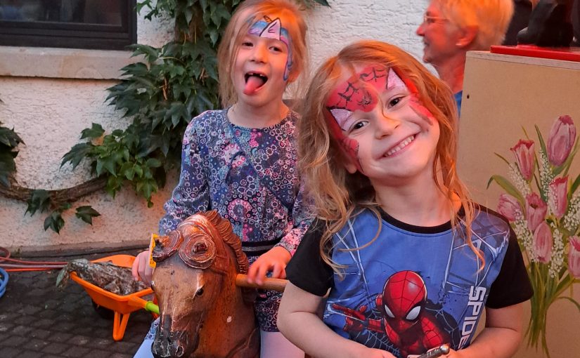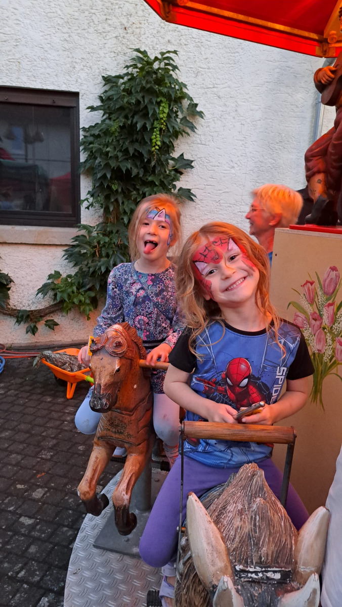 Das Kinderkarussell von Malte Schütrumpf drehte sich unermüdlich mit kleinen Fahrgästen – es sollen sogar Erwachsene dem Ruf des Karussells gefolgt sein, wurde gemunkelt. Ergänzt wurde das Angebot für die kleinen Freundinnen und Freunde des DCC durch das Kinderschminken: Natalie und Melanie Mumm zauberten wahre Kunstwerke in die kleinen Gesichter. Cordula, der DCC-Walking Act, durfte natürlich auch nicht fehlen.