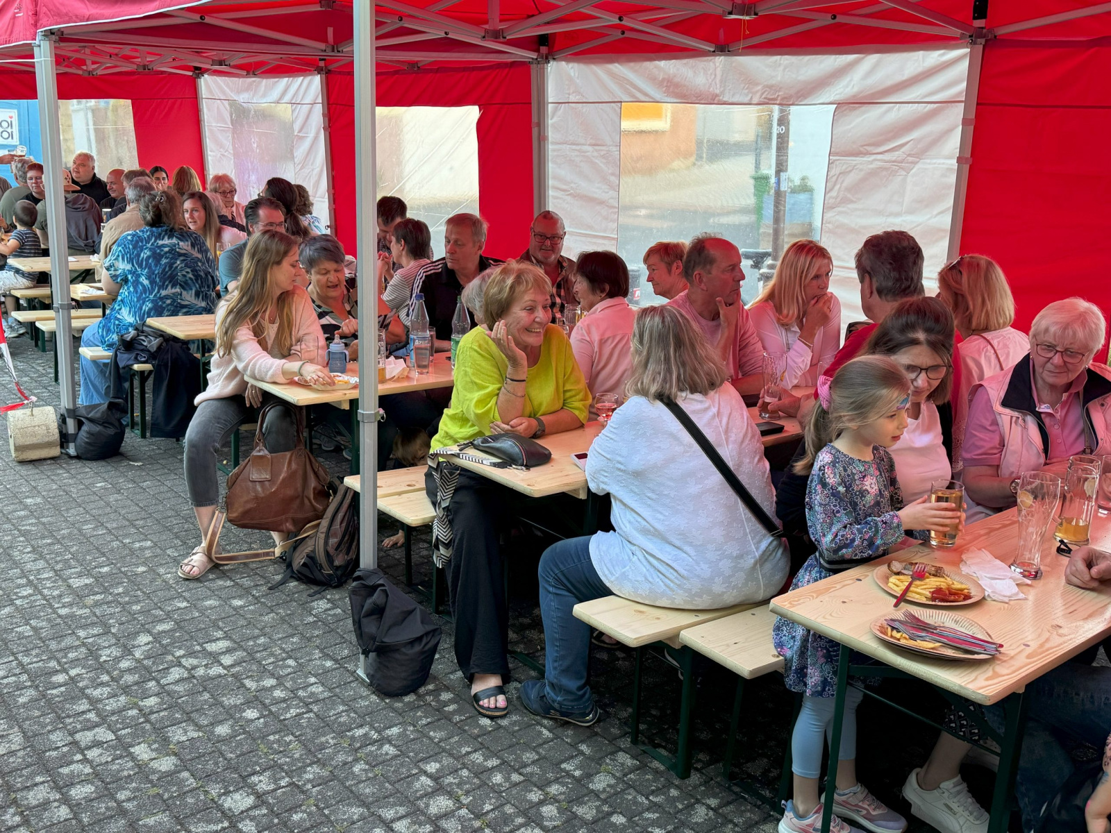 Besucher auf den Draiser Dorfplatz. Die Plätze an den nagelneuen DCC-Bierzeltgarnituren unter den rot-weißen Zelten waren restlos gefüllt, selbst wenn das Wetter anfänglich nicht so recht mitspielen wollte. Getränke von Kaffee bis zum alkoholfreien Weizenbier wurden von den Besuchern reichlich konsumiert; das bunte Kuchenbuffet fand viele Abnehmer. Hansi Sprenger sorgte wie immer für den guten Ton und die Musik.