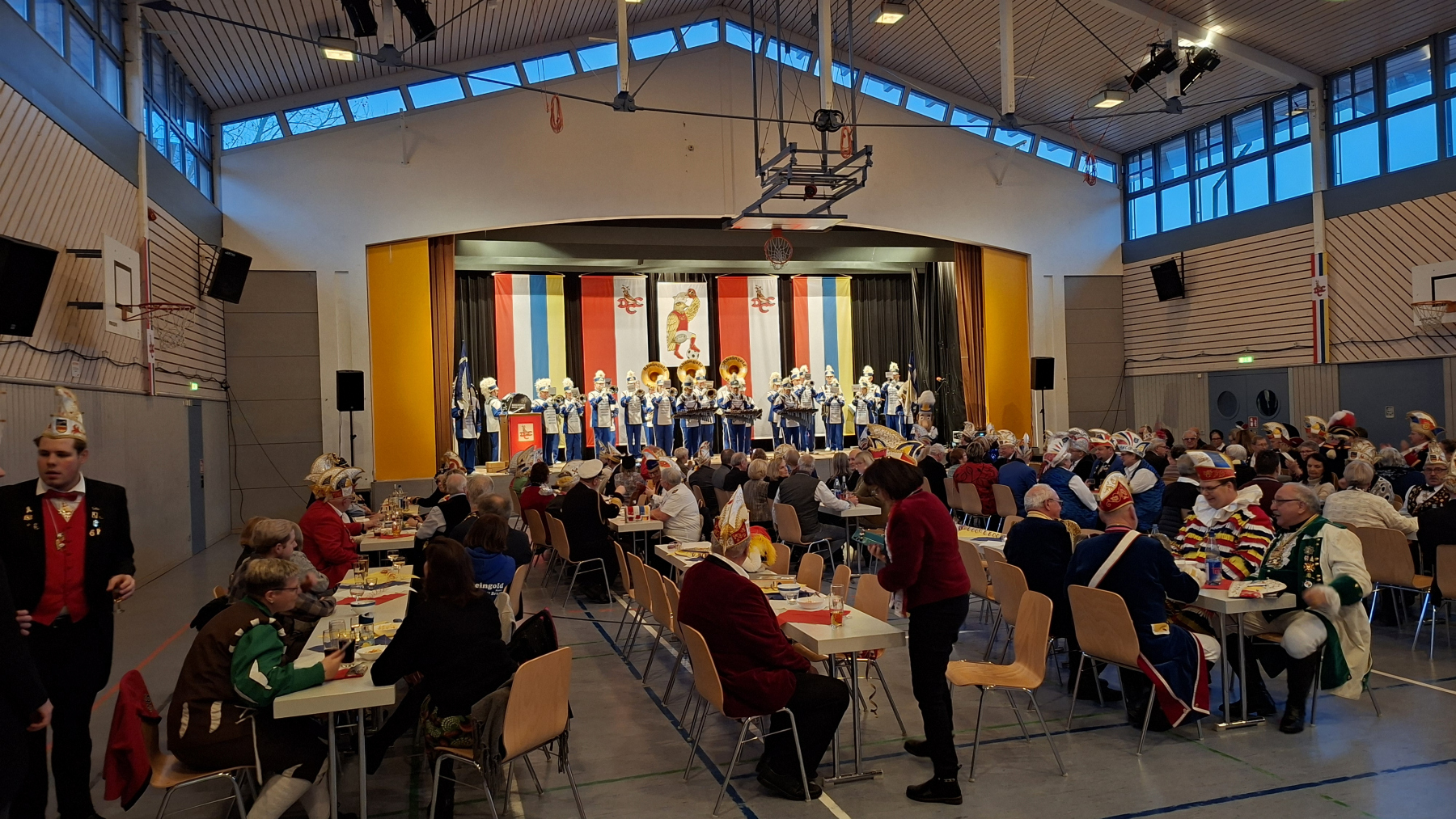Die Veranstaltung wurde von unserem Sitzungspräsidenten Jürgen Katluhn und dem 1. Vorsitzenden Joachim Kleintitschen moderiert und bot den circa 200 Besuchern ein buntes Programm aus Show, Musik und Tanz. Die Musicshow – & Marchingband Rheingold Show & Brass (Stabführung: Jeannette Rosenbaum) eröffnete mit einem umfangreichen Programm, die Showtanzgruppe Destination legte einen flotten Showtanz angelehnt an das Musical „Wizard of Oz“ auf die Rostra, und der Mainzer Mainzer Mischungschor bot ein Potpourri fastnachtlicher Klänge.